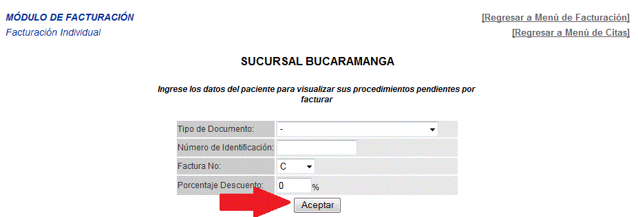 | 3. Luego se ingresa un paciente que haya sido admitido, sea de la sucursal en sesión y no haya sido facturado anteriormente y se da click en Aceptar: |